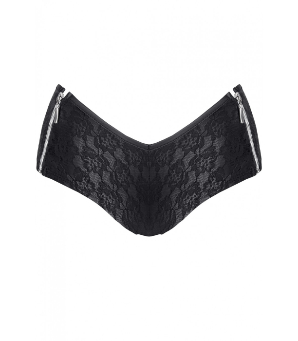 Incredibly sexy triangle-shaped shorts. On the front, two beautifully arranged silver decorative zippers. At the back, the buttocks are charmingly exposed by a specially profiled cut. The shorts are made entirely of black stretch eco-leather with a characteristic print. It is a pleasant material to the touch and adapts perfectly to the body
