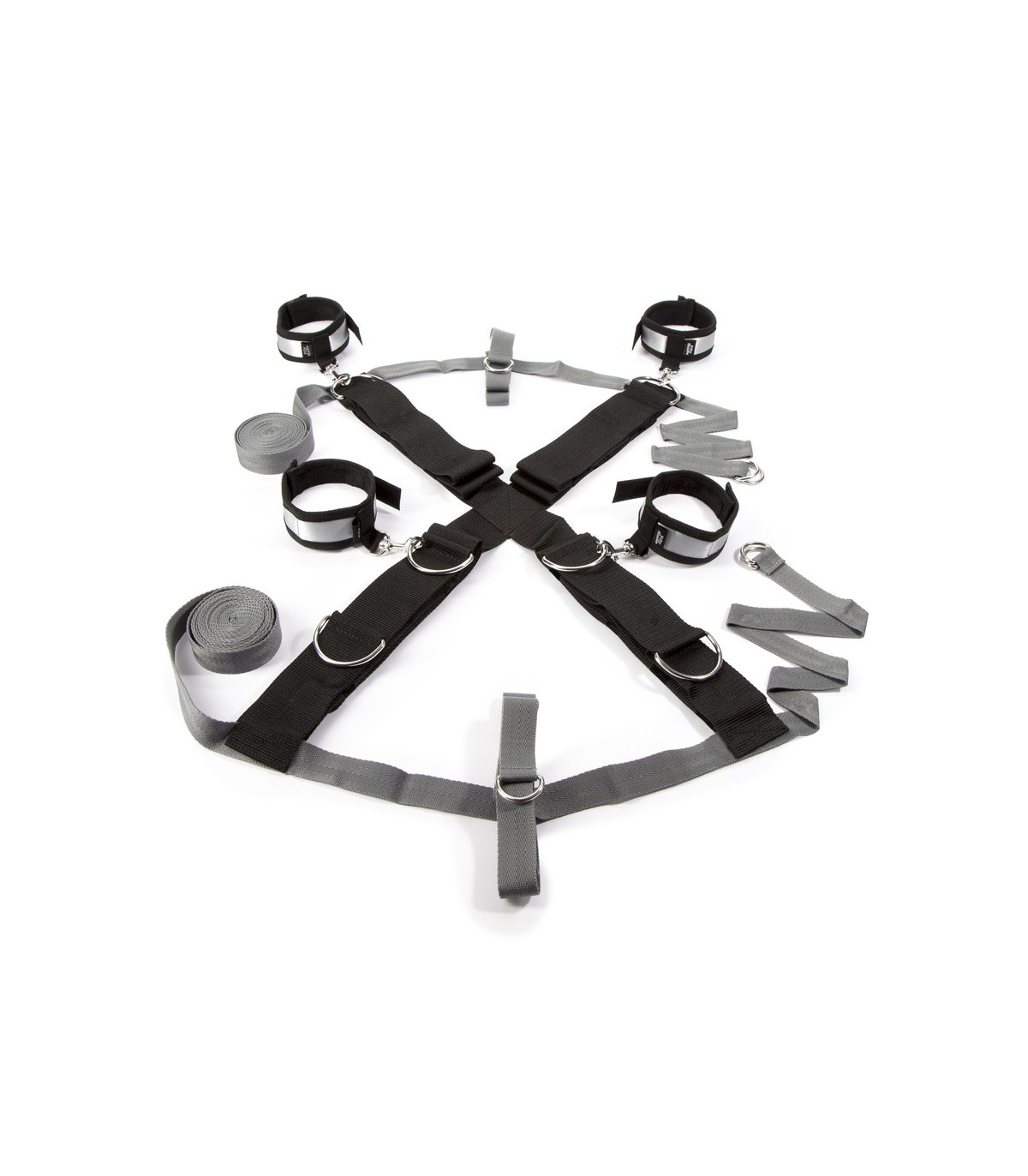 Discover new styles of bondage games with this cross restraint for the bed that allows the wrist and ankle cuffs to be positioned both horizontally and vertically. A luxurious twist on the classic restraint system, inspired by the Fifty Shades of Gray books.