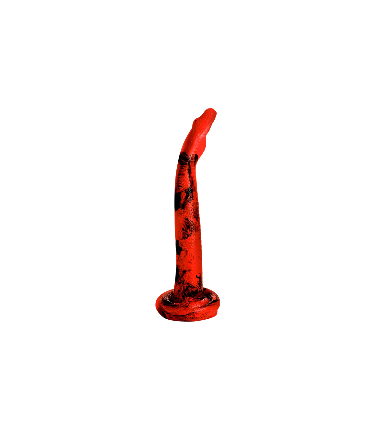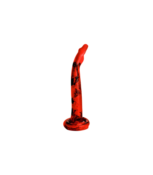 Are you ready to be devastated? See how good of a snake charmer you are with this 18-inch Cobra. Designed to unroll and slide deep into your backdoor entrance, it is textured with enticing details that add an intense sensation to your backdoor exploration. The tip of the hose is shaped like a cobra's head. You'll enjoy that wide flare of her wide neck as it bursts inside. The straight and round nose makes insertion easier. It has a vibrant red and black body with textured scales that run to the rolled base. Firm and flexible, it is made from body-safe, premium silicone and is phthalate-free. Use only with water-based lubricants for best results. The base has a strong suction-cup on it so you can have those hands free to guide the snake into your cave. The wide base is also perfect for pairing with a strap-on harness. Enjoy several ways to play with this sinful snake. Enjoy exploring your playful and wild side. Try some kink cosplay or fantasy gestation. After use, wash it with warm water and mild soap, then spray it with toy cleaner and let it air dry.
