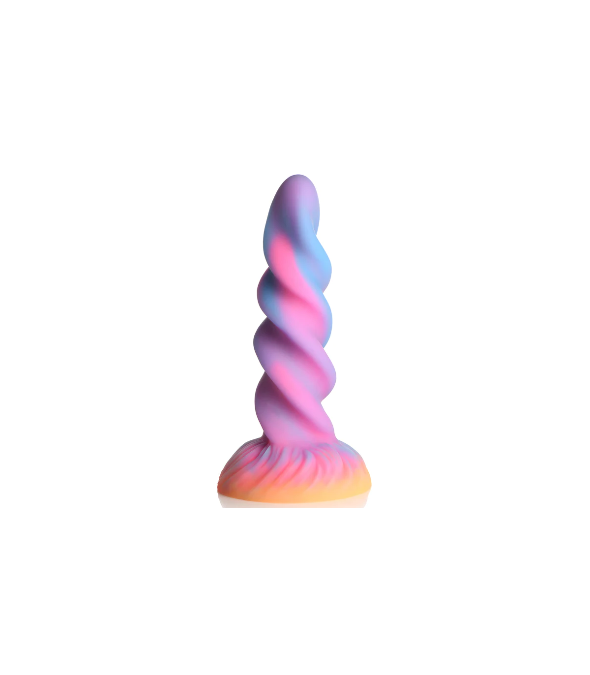 Magic comes in many shapes and sizes, and this Unicorn dildo from Moon Rider is the perfect shape for you. The burst of purple, blue, pink and yellow colors are bright during the day and bright when dark at night. It has a small pointed tip for easy insertion and a spiral horn with smooth, round edges. Made from premium, flexible, phthalate-free silicone, this dong is body safe and best used only with water-based lubricants. Enjoy hands-free rides due to the strong suction cup base. Invite a partner to enjoy some cosplay or fantasy role play and use their favorite harness to transform this dong into a strapon. Afterwards, be sure to wash it with warm water and mild soap, then spray it with a toy cleaner and air dry. Keep out of direct sunlight and heat.