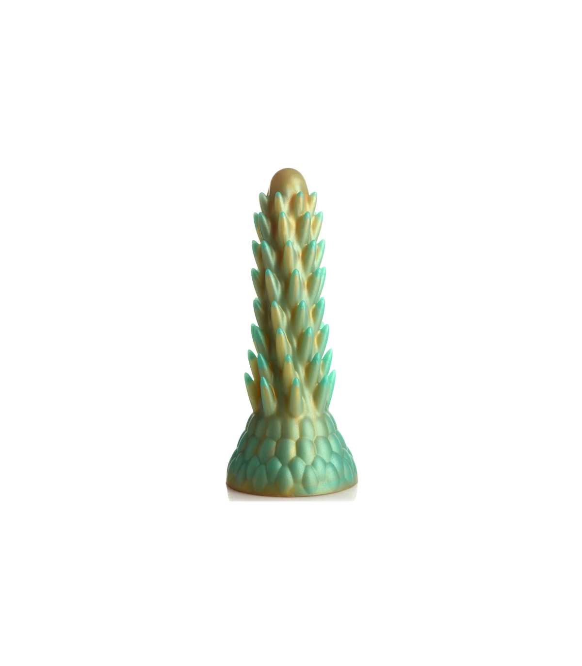 If you've ever found a stegosaurus's tail to be a turn-on, or loved hugging a tall, prickly cactus, this reptilian dildo is for you. It will treat you nicer than the aforementioned plant or creature, and will add incredible new sensations as you explore its textured rod. It has a beautiful gold and teal color throughout the entire shaft. It caps to a thinner round tip for easier insertion. The base is round and covered in scales, while the shaft itself has long, round spikes that point towards you as you impale yourself on this fantastically stimulating toy. Made from premium, flexible, phthalate-free silicone, this dong is body safe and best used only with water-based lubricants. Enjoy hands-free rides due to the strong suction cup base. Invite a partner over for some cosplay or fantasy roleplay and use your favorite harness to transform this dong into a strap-on. Afterwards, be sure to wash it with warm water and mild soap, then spray it with a toy cleaner and air dry. Keep out of direct sunlight and heat.