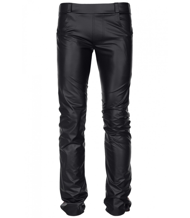 Long pants with wetlook effect pockets.