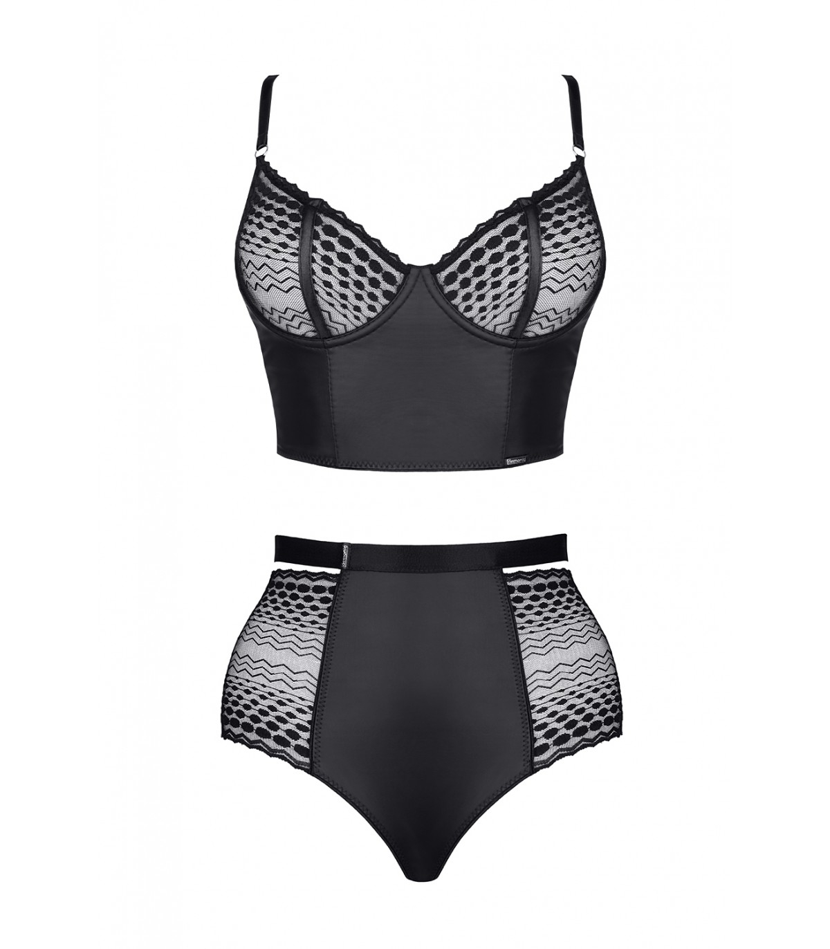 The bra seduces thanks to the effective combination of black geometric lace and matte wet material. The cups and sides of the bra are specially reinforced with underwires. Thanks to this solution, the breasts and neckline look very attractive.