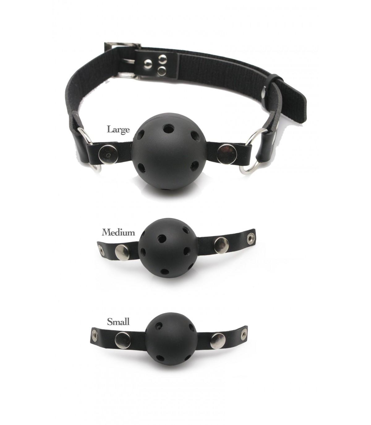 The 3-gag training system allows you to start with a small one and gradually work your way up to the largest, going from gentle to wild as you progress! Each gag is interchangeable using the snaps, made from non-toxic plastic and fitted with holes for easy breathing. The durable black vinyl strap easily adjusts to fit most sizes, giving you instant control over when and how often your lover speaks. You'll be teaching your partner the meaning of submission in no time - remember, practice makes perfect!