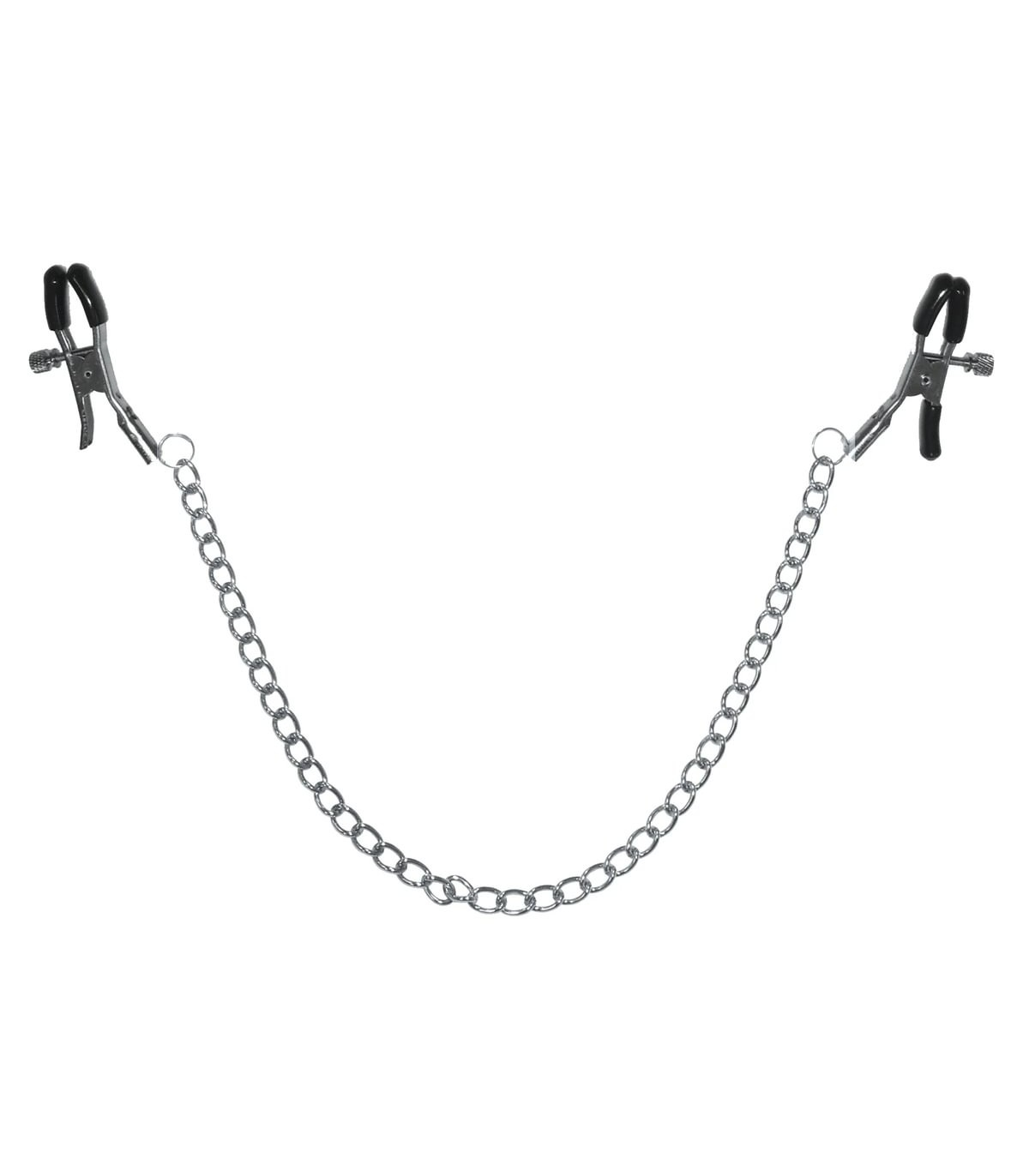 Test your limits, or your partner's, with this BDSM essential. Featuring rubber tips for comfort, these clamps are an ideal accessory for those inclined toward masochistic or submissive roles, although anyone can enjoy the teasing torment of nipple toys. Thumbscrews allow you to adjust the pressure on each nipple, while a connecting chain gives you something to tug on as you approach climax. Get creative and try these clamps on other body parts!