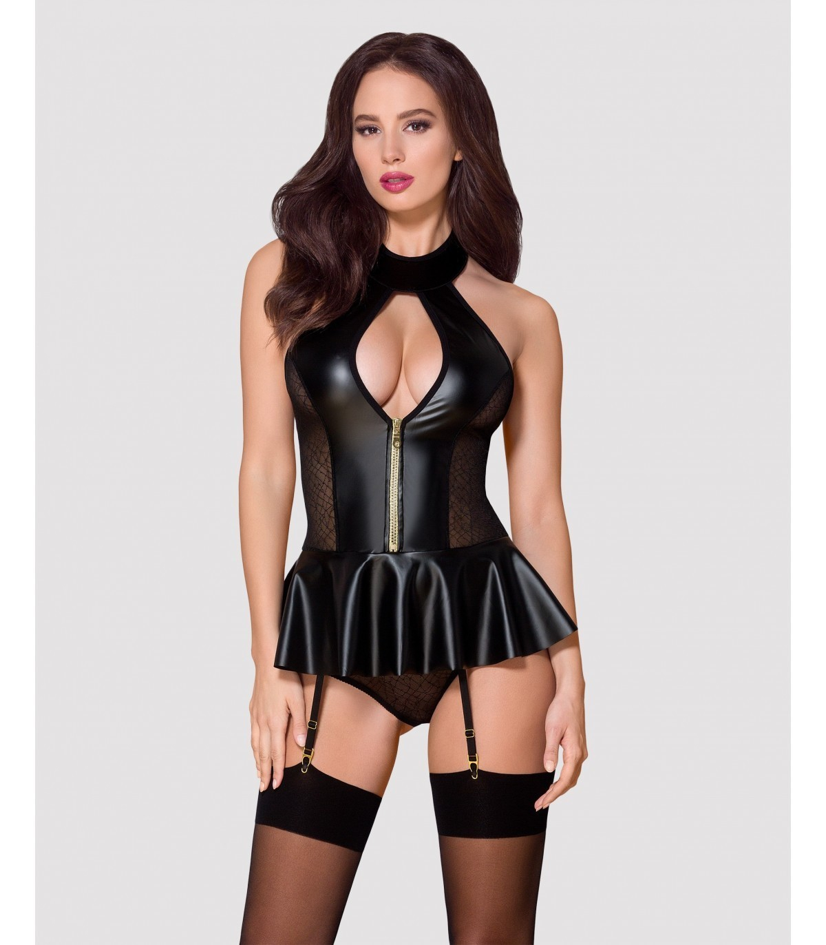 Corset set with matching skirt and stockings.