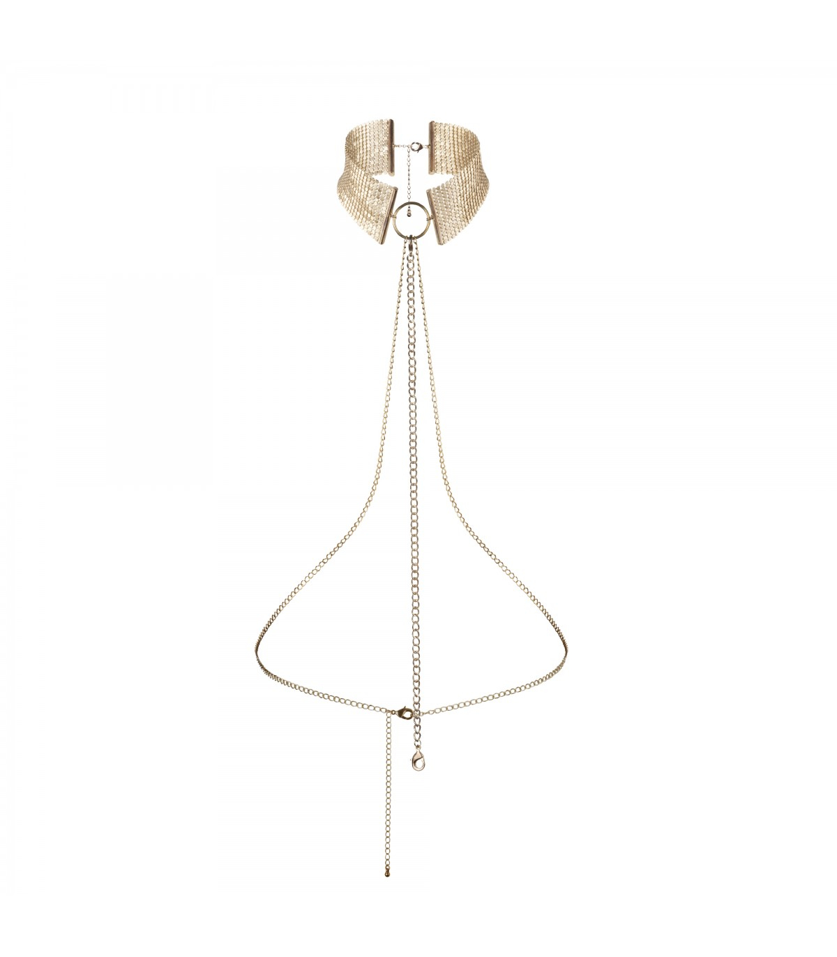 Chain his gaze to the silhouette of your body and unleash your imagination. Wear Désir Metállique as an accessory on any occasion, and wear it whenever you want to practice suggestive bondage games in privacy. Measurements: Neck, Min: 30 cm - Max: 59 cm. Contents: metal mesh choker accessory and adjustable chain belt. Available in black, silver and gold.