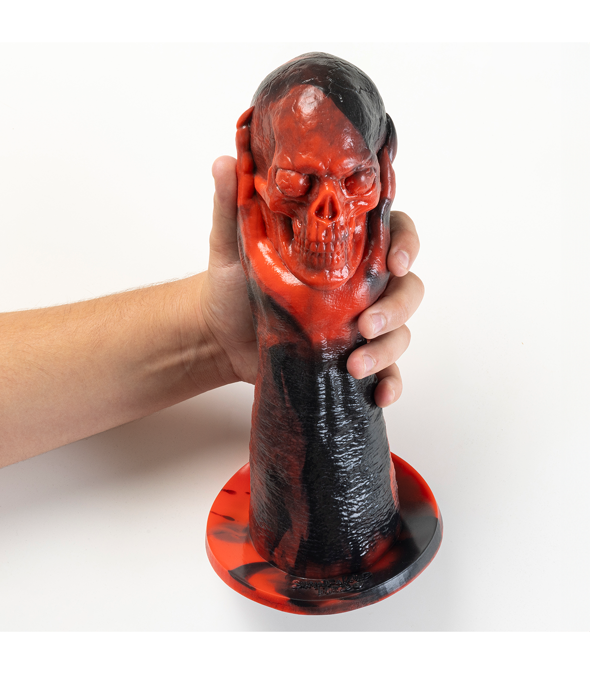This dildo has a rounded shape at the end, simulating a skull held by an arm.