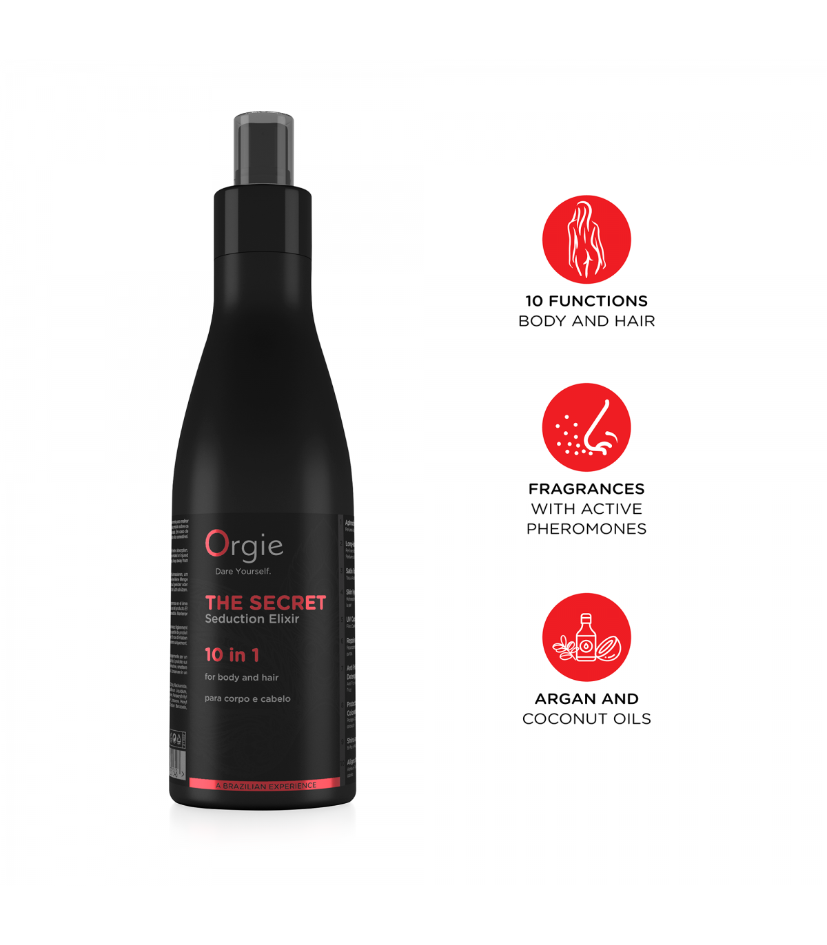 The Secret Seduction Elixir 10 in 1 body and hair lotion with pheromones. Effective in its 10 functions. Aphrodisiac aroma Active pheromones Satin skin Skin hydration Ultraviolet hair filter Repair of hair ends Detangling and anti-frizz hair Hair color protection Hair shine and softness Aligns hair strands.