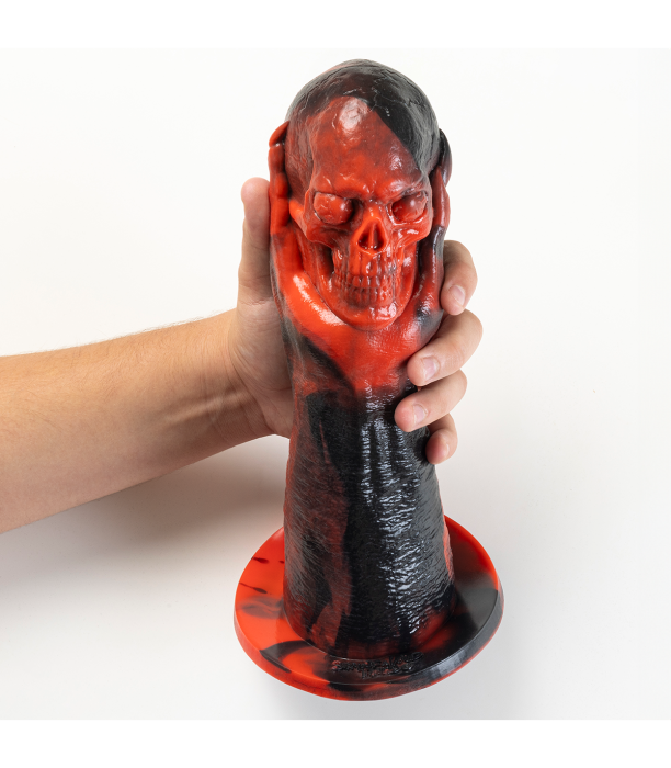 This dildo has a rounded shape at the end, simulating a skull held by an arm.